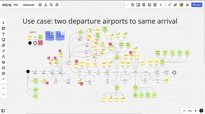 As a sidenote, while working on the code, my mind was continuously racing to new problems around travel. Which city to choose? What to do at the destination when we get there? What if one of us is in a different city? (I travel a lot due to my job and can work on a project in a different part of the world for months.) When this happens, to keep me focused on a single problem, creating a mind map, noting down the ideas helps me to organize them — so I made a Miro board, structured around my problem and the possible decisions.