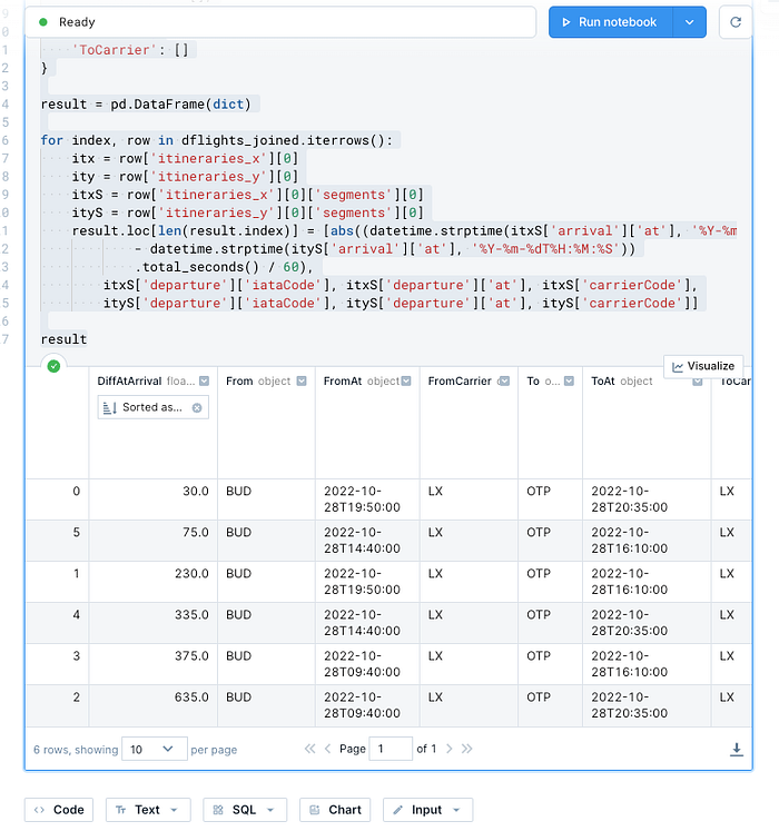 dflights_joined = pd.merge(dflights1, dflights2, how='cross')To look into the structures embedded deep in the itineraries column, I printed the rows in Deepnote: