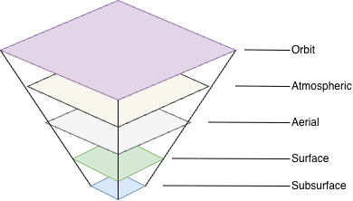 In this case, the layers would follow from the top to bottom, smallest the subsurface and largest is the orbit. Deep space is represented as reserve unit list that can be deployed but takes time for them to arrive to orbit.