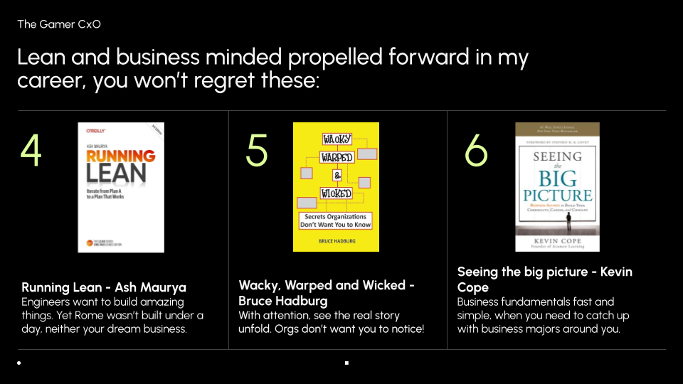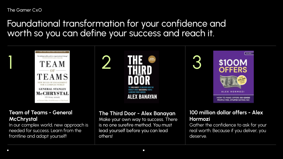Foundational transformation for your confidence and worth so you can define your success: Team of Teams from General McChrystal, The Third Door from Alex Banayan and 100 million dollar offers from Alex HormoziLean and business minded propelled forward in my career, you won't regret these: Running lean by Ash Maurya, Wacky, Warped and Wicked from Bruce Hadburd and Seeing the big picture by Kevin Cope